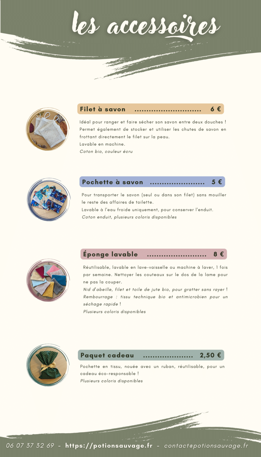- Les accessoires : dans une volonté zéro déchet et écologique, nous vous proposons des accessoires cousus main afin d’accompagner vos savons dans votre salle de bain, lors de vos déplacements ou même jusque dans la cuisine !