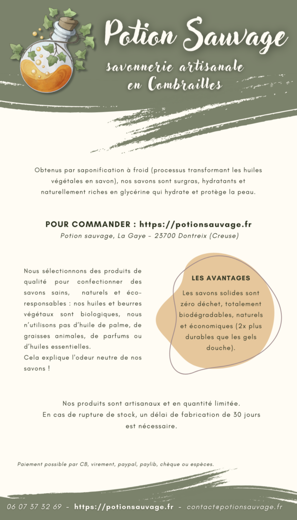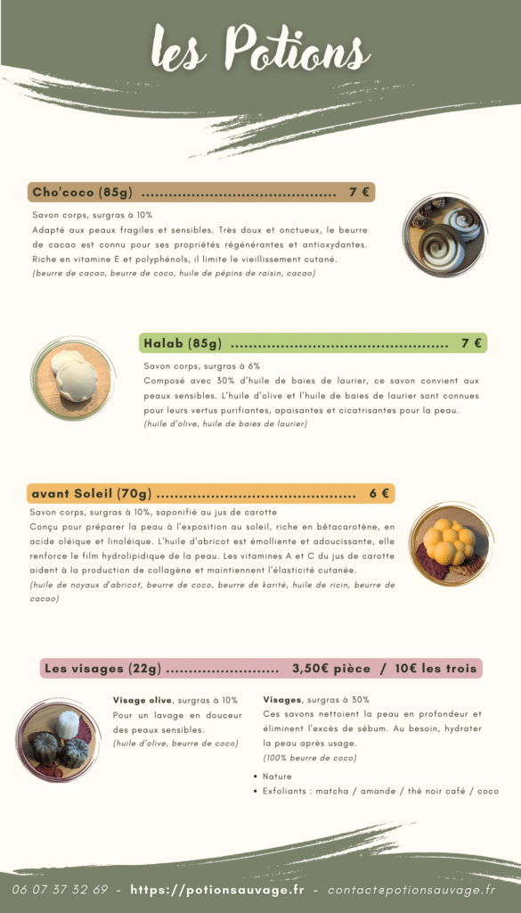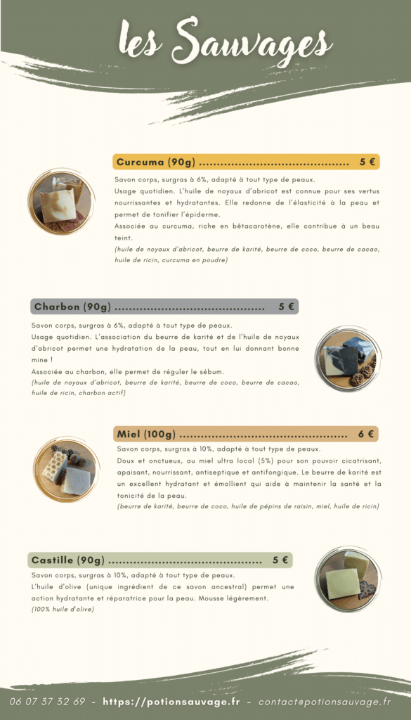 - Les potions : pensés pour un usage précis, ces savons sont fabriqués avec des huiles et beurres biologiques et précieux. Ainsi, ils conviendront aux peaux sensibles et fragiles car ils sont élaborés pour un besoin particulier pour chaque formule. Leur usage peut être quotidien ou plus ponctuel, en alternance avec un savon sauvage !