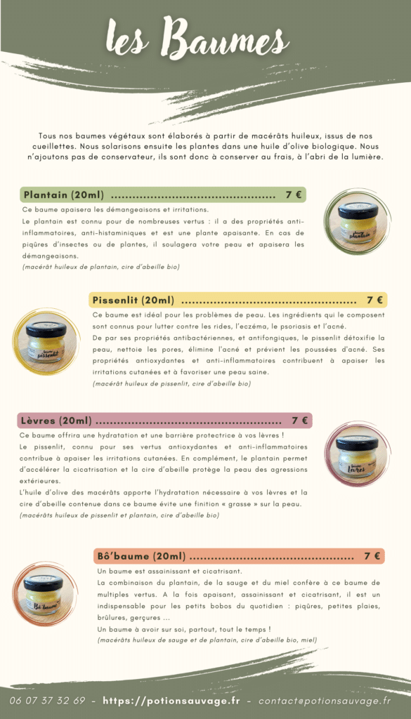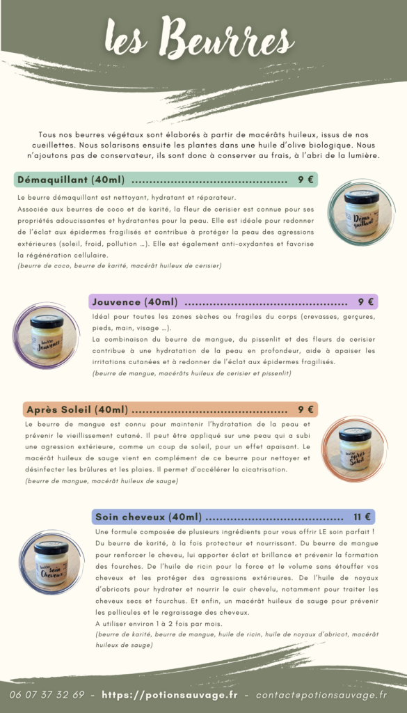 - Les baumes et beurres végétaux : ils sont élaborés à partir de macérâts huileux, issus de nos cueillettes. Nous solarisons ensuite les plantes dans une huile d’olive biologique. Nous n’ajoutons pas de conservateur, ils sont donc à conserver au frais, à l’abri de la lumière.
