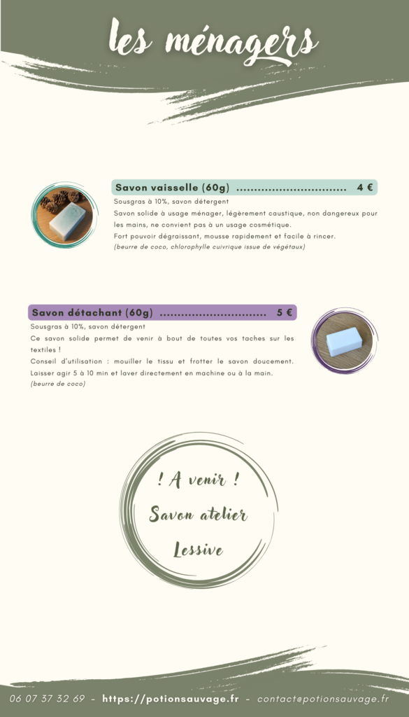 - Les ménagers : cette gamme va s’agrandir sous peu ! Retrouvez pour l’instant un détergent pour la vaisselle et un détachant pour le linge. A venir : lessive et savon atelier … très bientôt !