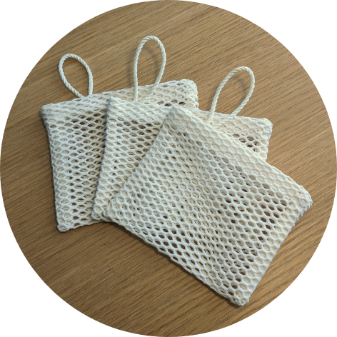 Un petit filet artisanal en coton qui permet de glisser vos restes de savons et chutes pour ne rien gaspiller. Il transforme chaque petit morceau en un savon pratique à utiliser sous la douche.
