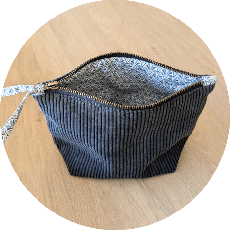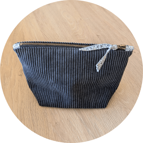Trousse de toilette en velours côtelé gris anthracite et intérieur coton, motif imprimé.